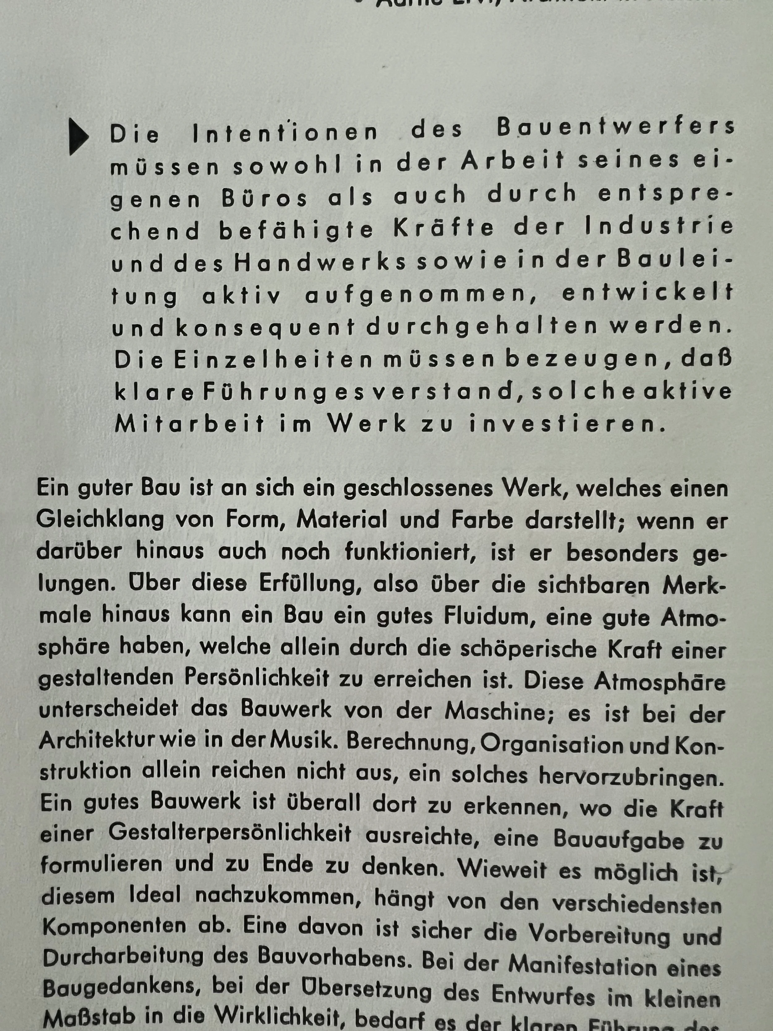 A good construction is in itself a closed work, which represents a harmony of shape, material and colour; if it also works, it is particularly popular. Above this fulfilment, i.e. beyond the visible characteristics, a building can have a good fluidum, a good atmosphere, which can only be achieved by the beautiful power of a shaping personality. This atmosphere distinguishes the building from the machine; it is in architecture as well as in music. Calculation, organisation and construction alone are not enough to produce one.