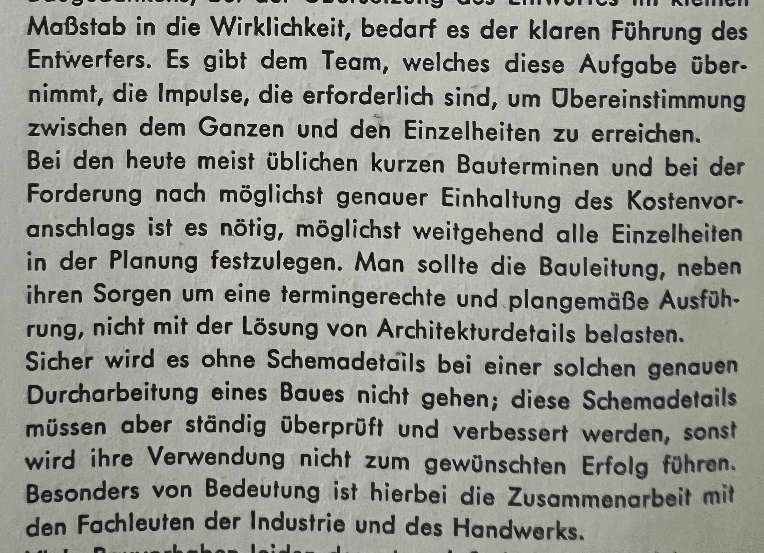 A good building can be recognised wherever the power of a designer personality was sufficient to formulate a construction task and to think it to the end. How far it is possible to fulfil this ideal depends on the most diverse components. One of them is certainly the preparation and processing of the construction project. In the manifestation of a building idea, in the upperposition of the design on a small scale into reality, the clear guidance of the designer is required. It gives the team that takes on this task the impulses necessary to achieve agreement between the whole and the details.